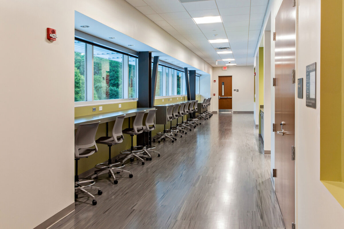 There are 61 rooms in the three-story structure including classrooms, offices and several specialty and mix-use rooms. One of such specialty rooms is a Lecture Hall featuring tiered seating with space for 48 students. The building also houses simulation suites each consisting of 4 individual Simulation Rooms & an ICU / Infection Control Simulation Room with 2 Control Rooms observing lab exercises behind one-way glass. Additionally, there is a Clinical Skills Lab complete with 10 bays set up for simulations.